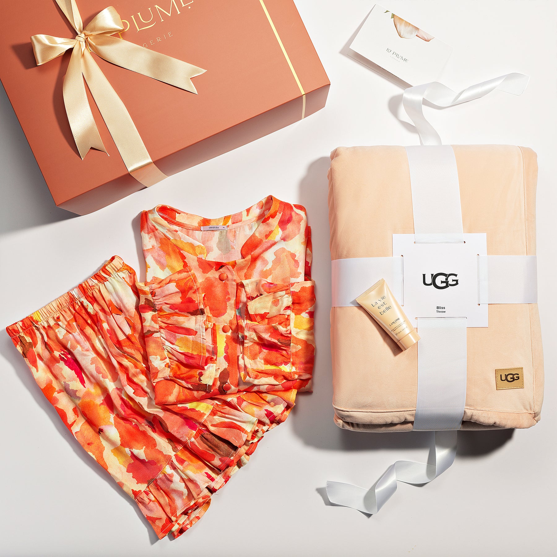 Give the gift of cozy luxury with the Soft Moments Lounge Gift Set — a beautifully curated pairing of ultra-soft comfort and chic sophistication. This set brings together a plush UGG reversible oversized throw that feels like a warm hug and an elegant Boss Alive fragrance that adds a delightful, modern scent to her everyday. Perfect for birthdays, holidays, or just because, this set wraps comfort and style into one unforgettable present.