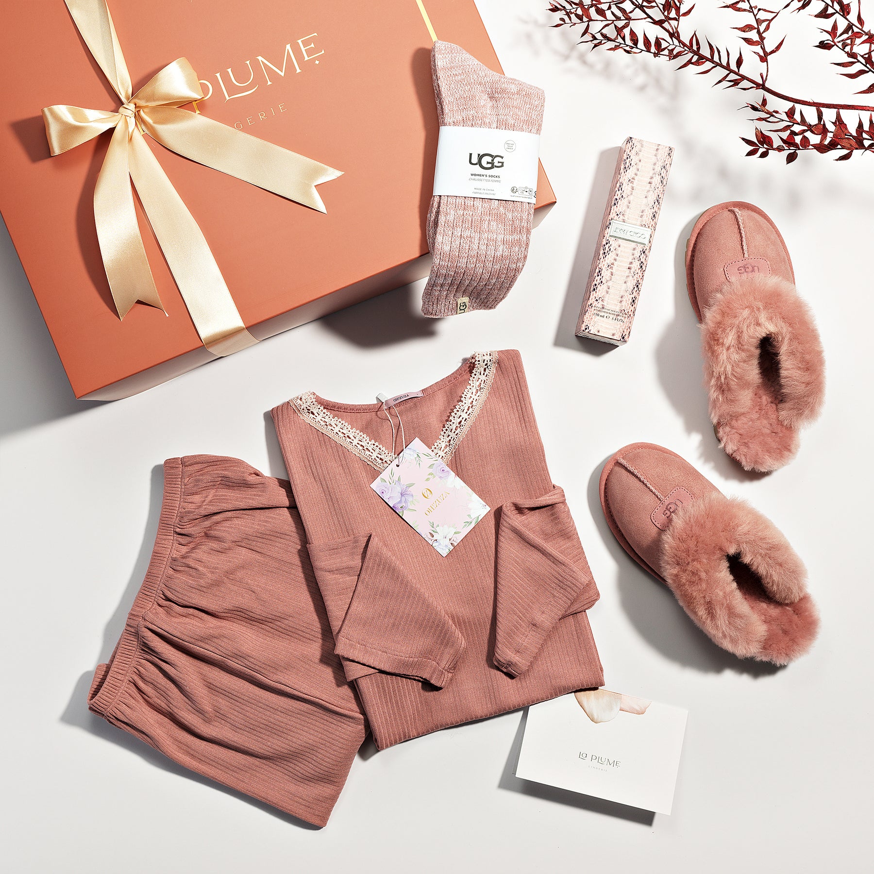 The Rosé Nights Cozy Lounge Gift Set is a beautifully curated collection designed for slow evenings and soft moments at home. Featuring plush UGG favorites, cozy lounge essentials, and a touch of luxury fragrance, this set blends comfort and elegance in warm blush tones. Perfect for gifting, it arrives fully wrapped and ready to delight.