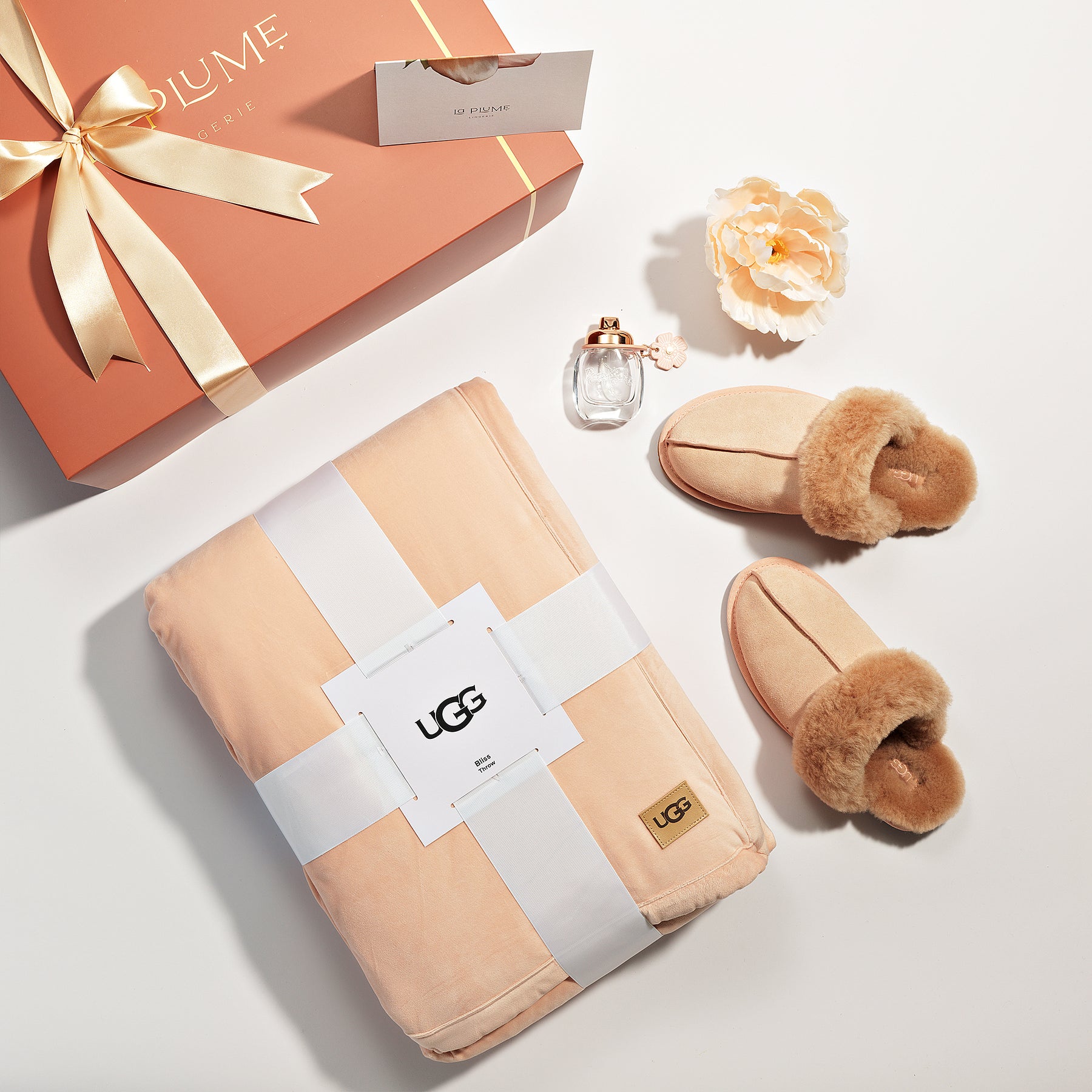 Wrap them in soft warmth with this dreamy peach-toned set. A cozy, elegant trio perfect for slow mornings and sweet moments at home. Each piece is chosen for its plush feel and elevated comfort, and the entire gift is fully wrapped with a custom note using your exact wording, delivered directly to their recipient.