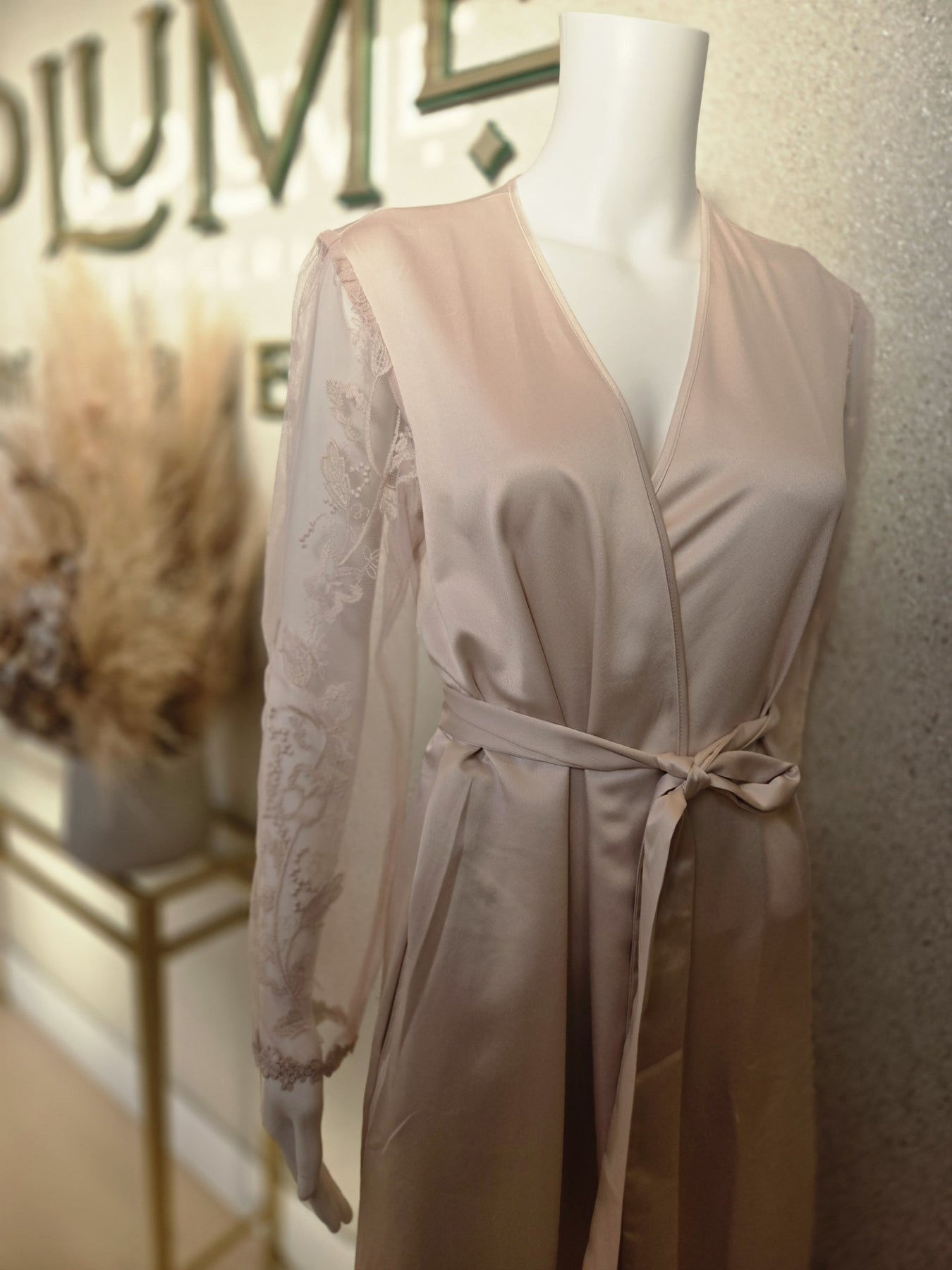 RYA Collection, silky , long robe with delicate lace sleeve , wrap style , waisted back design.