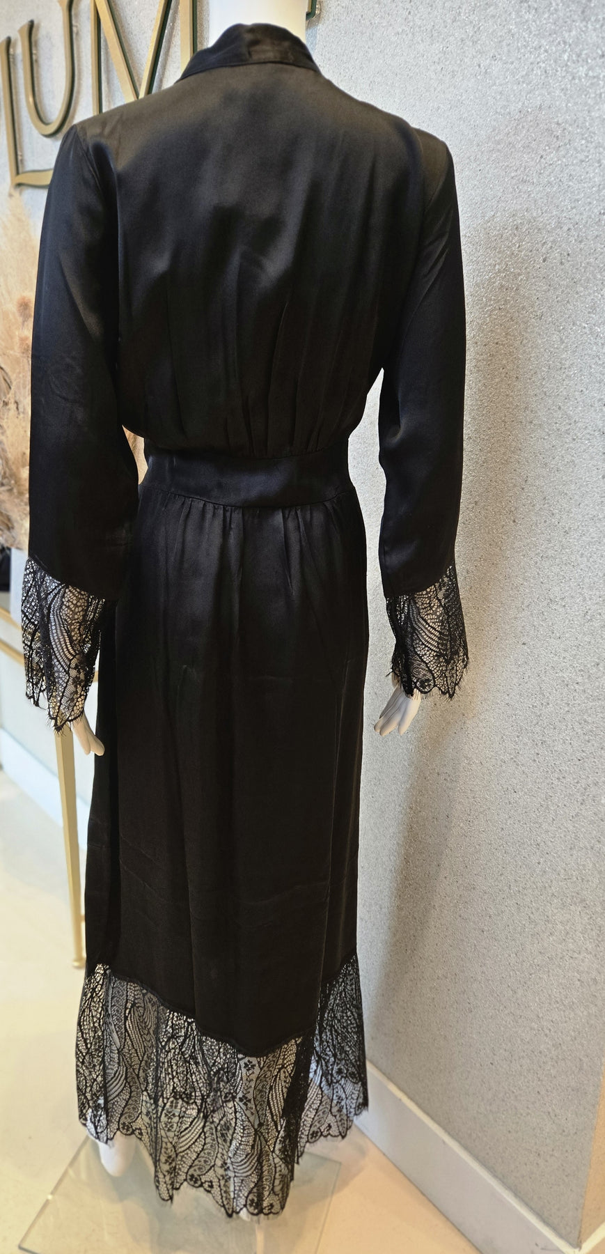 Rosella satin morning robe with lace detail. Set in belt with wrap around closure.