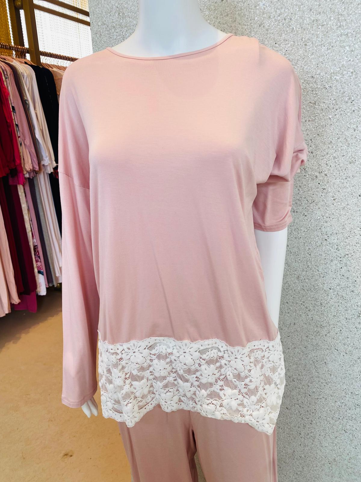 - Features: Long sleeve top, full-length pants, wide lace hem detail