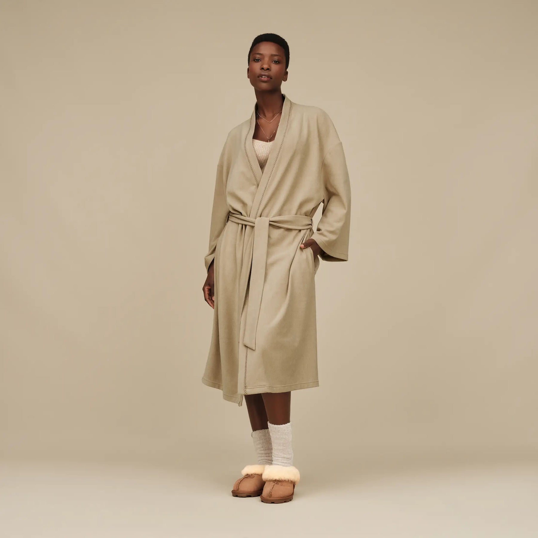 Slide into everyday comfort with the UGG Theron Robe, a relaxed-fit wrap perfect for cozy mornings, laid-back evenings, or gifting to someone who loves casual luxury. Made from a soft recycled-blend knit with tonal diamond-stitched seams and a self-tie belt, this mid-length robe adds effortless style to your at-home wardrobe with just the right amount of warmth and ease.