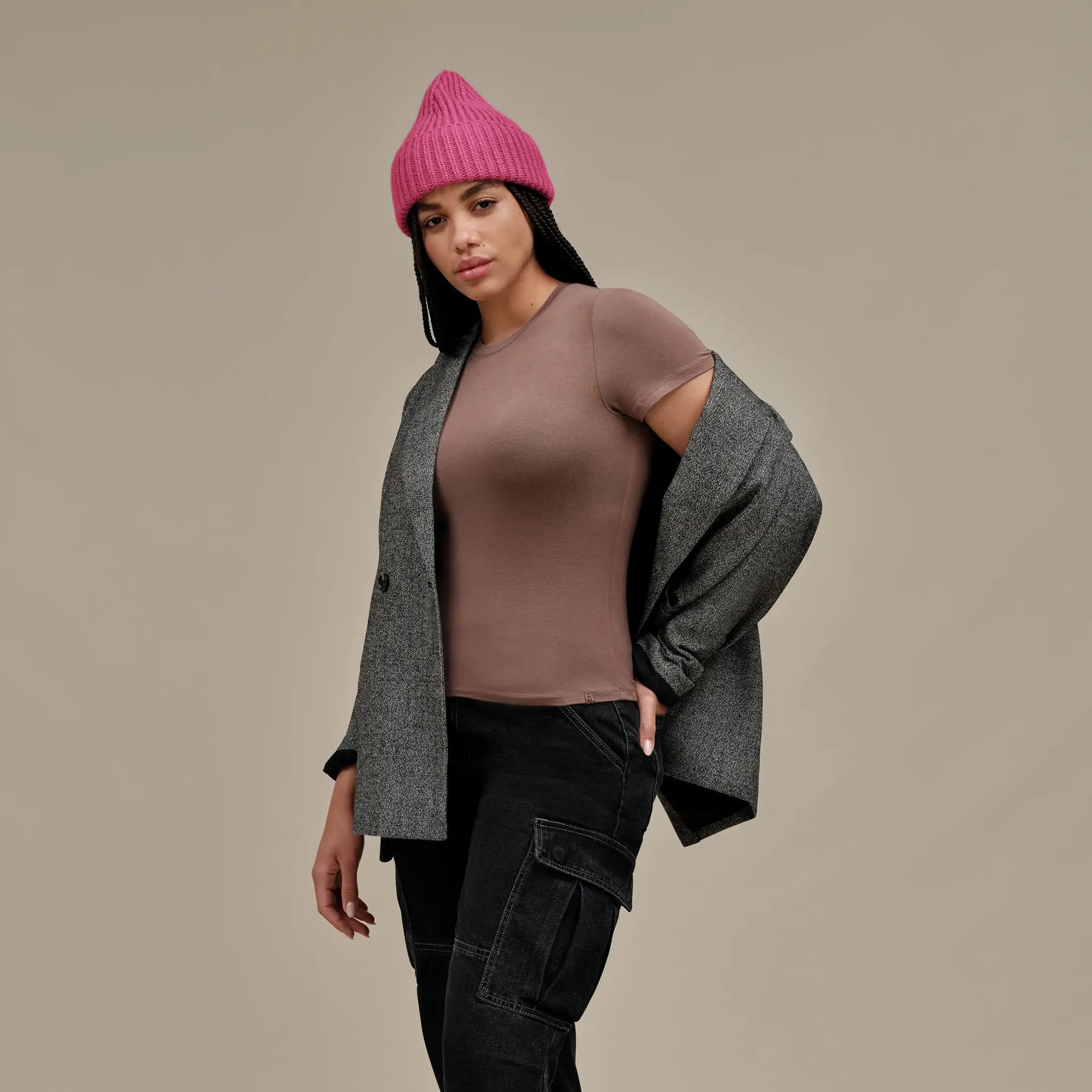 This dreamy allspice baby tee from UGG brings buttery-soft comfort and easy everyday style to your loungewear collection. Cut to hit at the high hip, its fitted crew neck silhouette feels like a second skin, perfect for relaxed days at home or layered under a cozy robe. Made with sustainably sourced fibers, it pairs beautifully with leggings, shorts, or your favorite joggers for a wardrobe staple that’s as versatile as it is comfortable.
