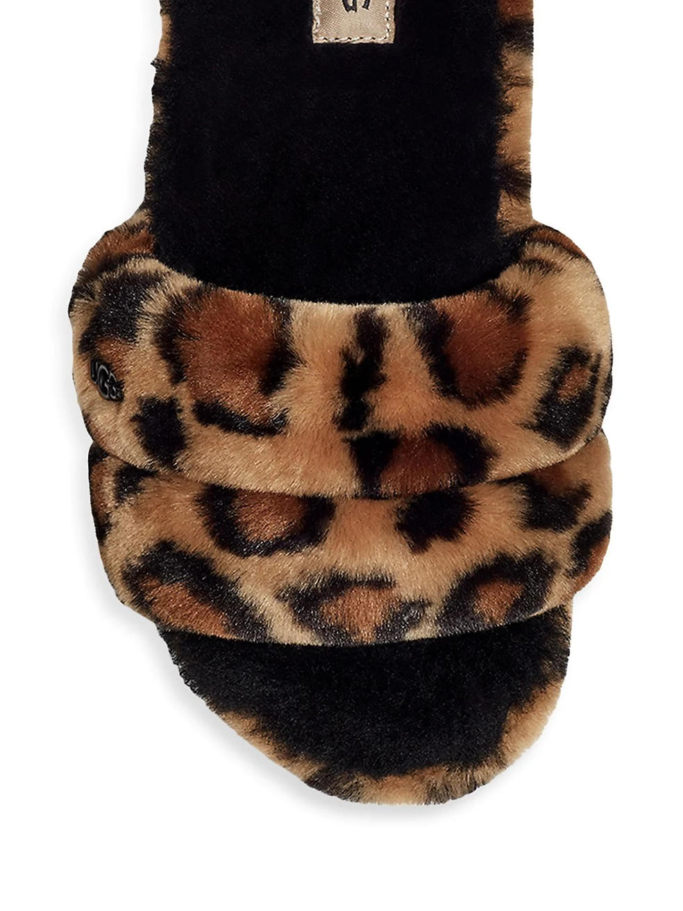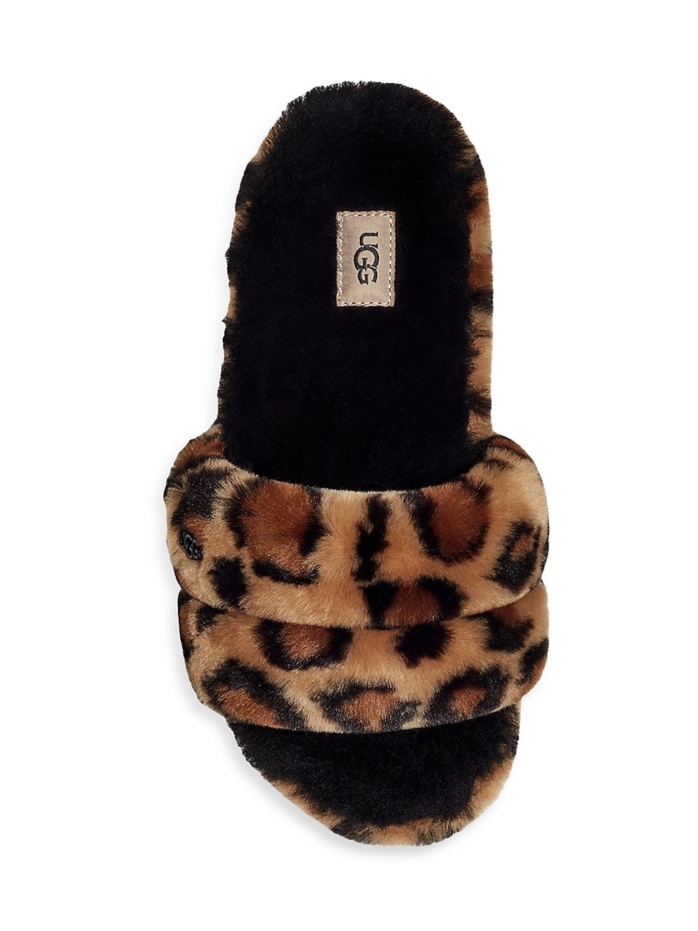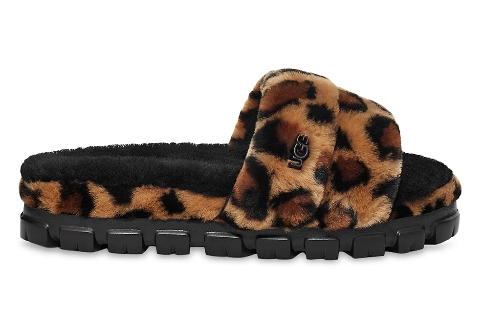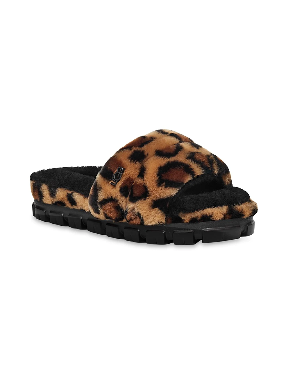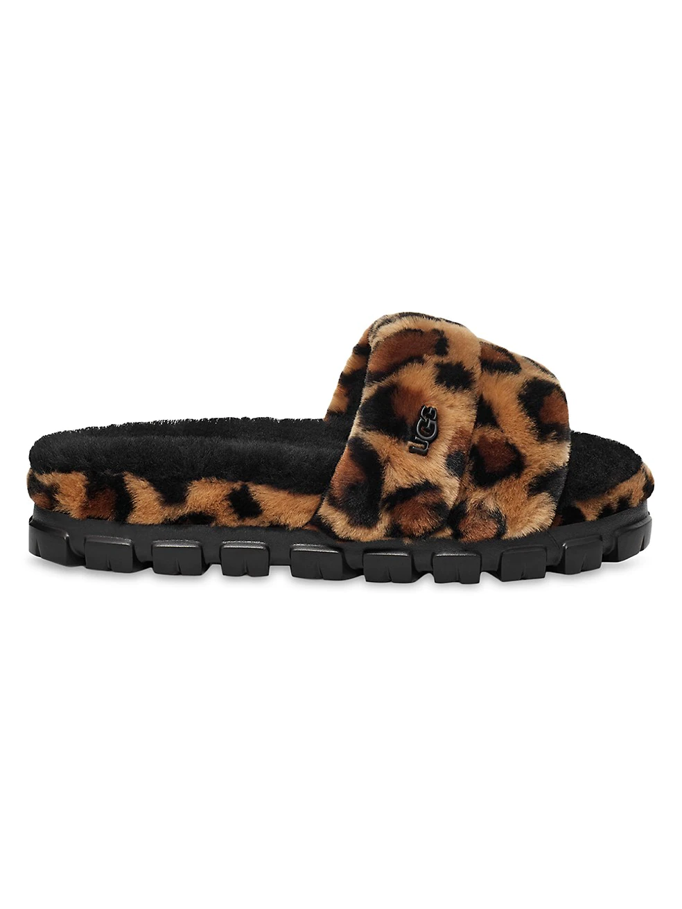 UGG's Cozetta slide sandals are crafted of leopard-printed faux shearling, set on a lug sole, and showcase a logo detail on the toe strap.