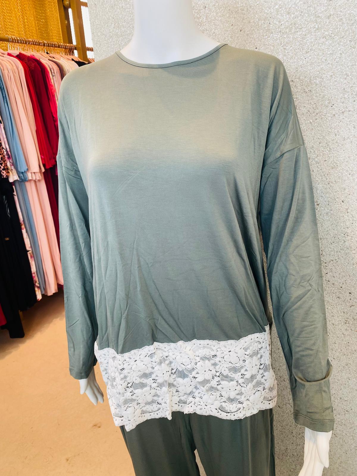 - Features: Long sleeve top, full-length pants, wide lace hem detail
